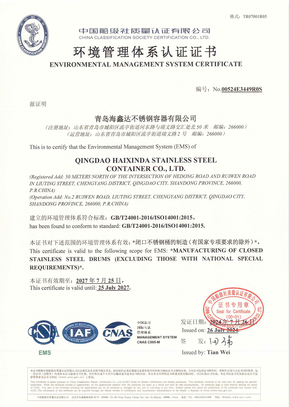环境管理体系认证书