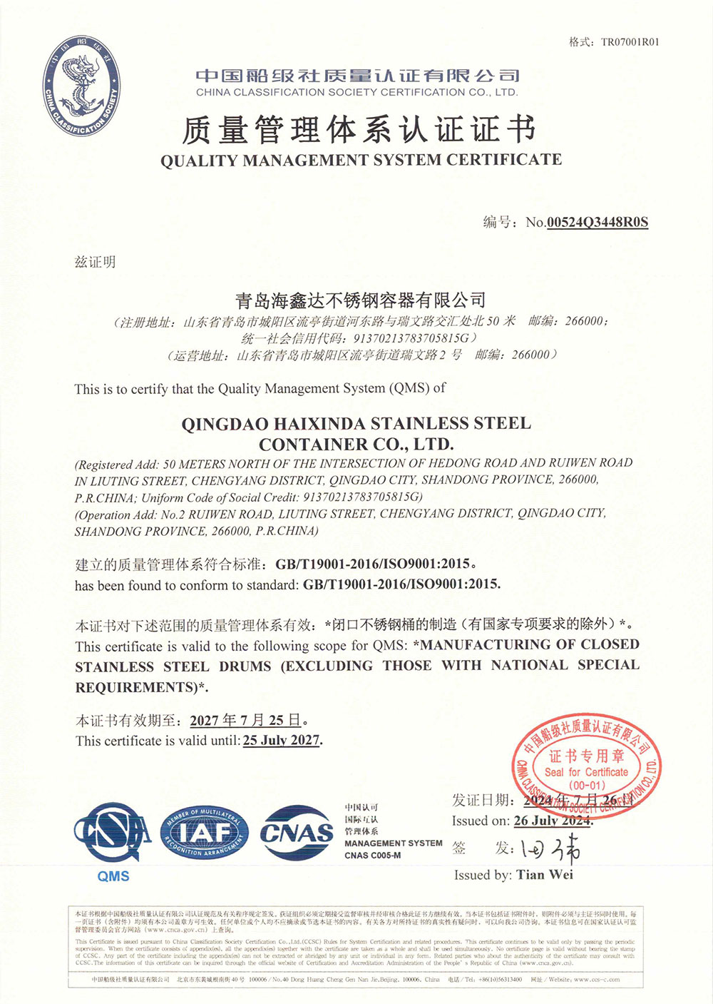 质量管理体系认证书